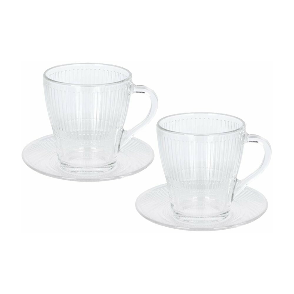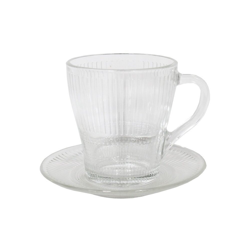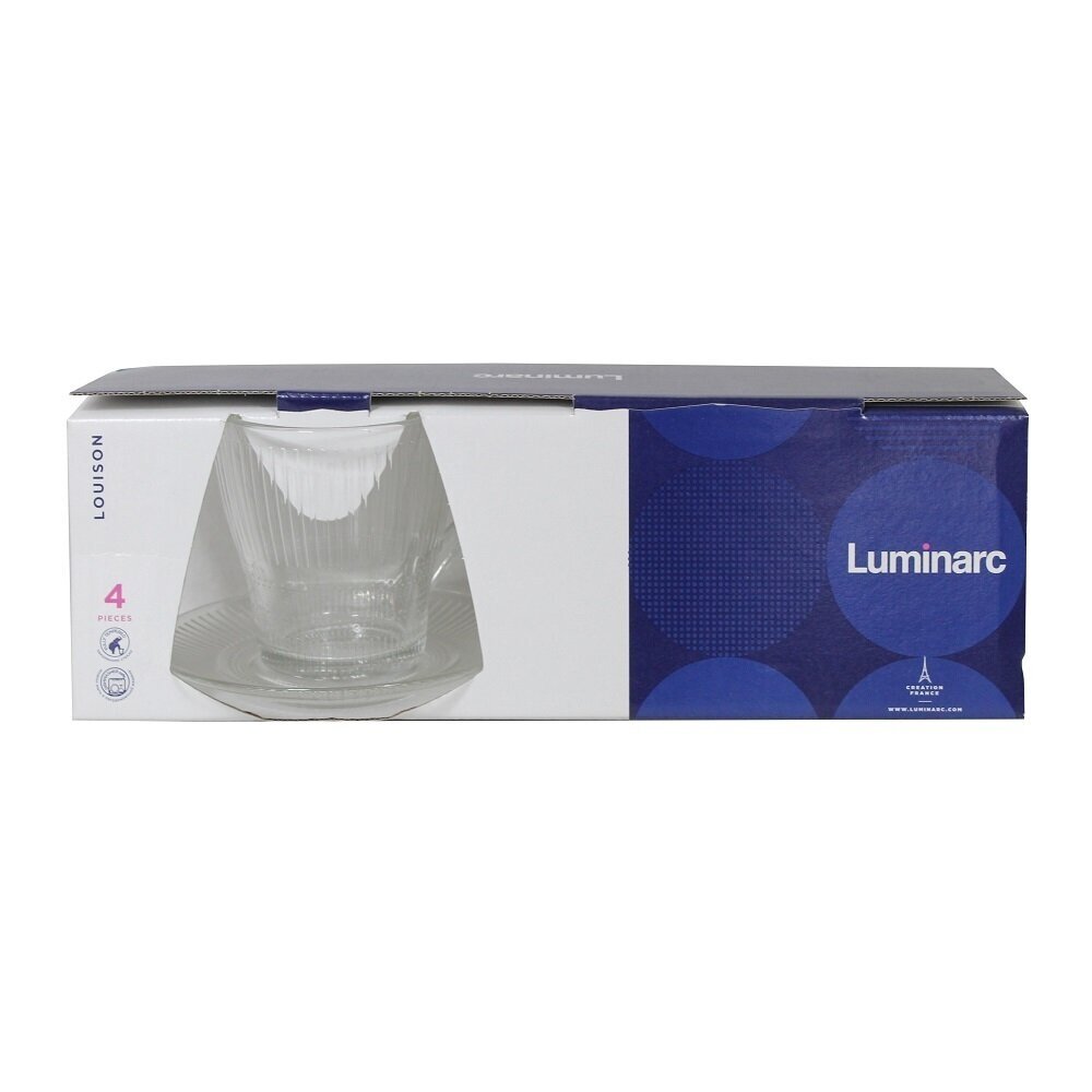Чайный набор Lousion Luminarc изготовлен из натрий-кальций-силикатного стекла. Сервиз состоит из 4-х предметов: 2-х чашек и 2-х блюдец. Изделия выполнены в прозрачном цвете, стенки изделий оснащены гранями. Такой набор будет отлично смотреться как на повседневном, так и на праздничном столе, станет отличным подарком. Можно мыть в посудомоечной машине, а также использовать в СВЧ. Состав набора:\nКружка: 280 мл (2 шт)\nБлюдце: 14 см (2 шт)