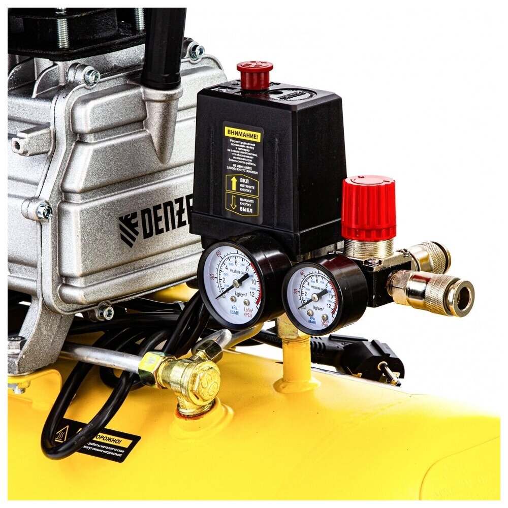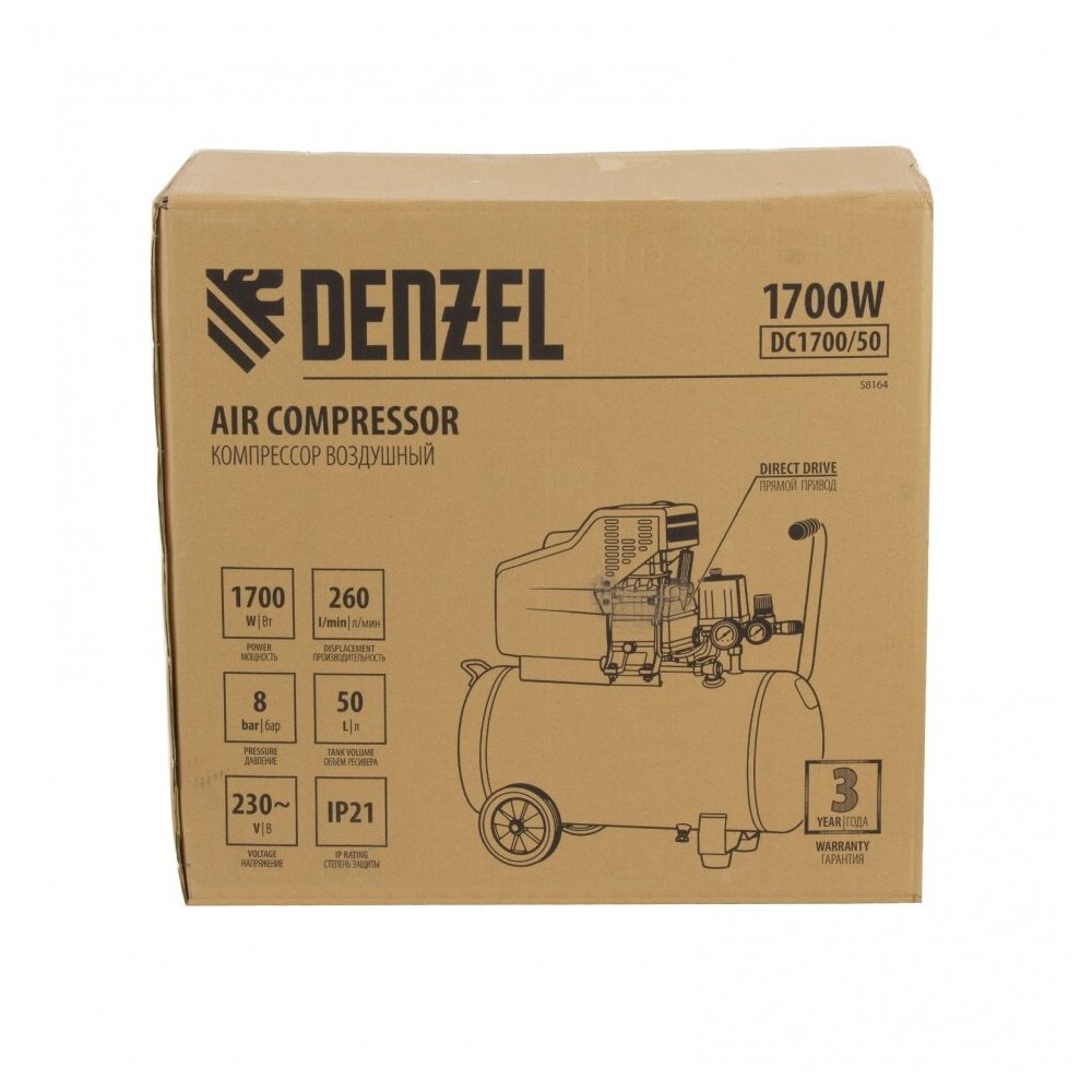 Компрессор Denzel DC1700/50 легко выдерживает интенсивные нагрузки. что позволяет использовать его как в быту. так и в профессиональной сфере: на стройке или в автосервисе. Объема ресивера 50 л и производительности на входе 260 л/мин достаточно для обеспечения работы пневмоинструмента. такого как: пневмошуруповерт. пневмонейлер. пневмостеплер. Встроенные защиты гарантируют долгий срок службы двигателя: при перегреве или коротком замыкании он отключается автоматически для предотвращения поломки.Преимущества: Высокий ресурс и надежность гарантируют качественные детали: коленвал и и цилиндр из чугуна. корпус фильтра и штуцеры из металла. Прилегающие поверхности картера проходят дополнительную механическую обработку. за счет чего исключается протечка масла. Большой ресурс ресивера благодаря стальным листам толщиной 2.3 мм с прочными сварными швами. Двигатель не перегревается благодаря оребренным трубам воздуховода. которые эффективно отводят тепло. Резиновый уплотнитель не допускает подсосов в обход фильтра. поэтому в ресивер поступает только очищенный воздух. Удобно подключать инструменты: предусмотрен быстросъемный коннектор EURO (Rapid). Контроль давления осуществляется с помощью двух манометров. Слить конденсат быстро и легко - пробка слива с упорами под пальцы откручивается без дополнительного инструмента. Простота и удобство перемещения по рабочей зоне - предусмотрены колеса и ручка. Гарантия 3 года.