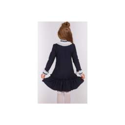 Платье прямое, чуть расширенное, с оборкой по низу. Воротник - стойка, рукав втачной, длинный, со сборкой по оканту. По переду кокетка, с застежкой на петли и пуговицы и декоративными строчками. Платье дополняет съемный воротник и манжеты из декоративного кружева с замшевой тесьмой.<br /><br />Покрой: прямой, расширенный к низу<br />Воротник: стойка<br />Вид рукава: втачной, длинный<br />Вид застёжки: по переду на кокетке петли и пуговицы<br />Детали одежды: кокетка по переду, оборка по низу