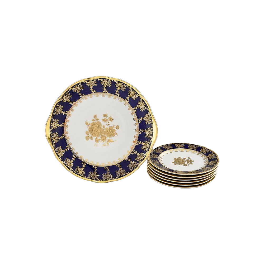 Сервиз для торта Мэри-Энн Темно-синяя окантовка с золотом, с тарелками 17 см, 7 пр., Leander