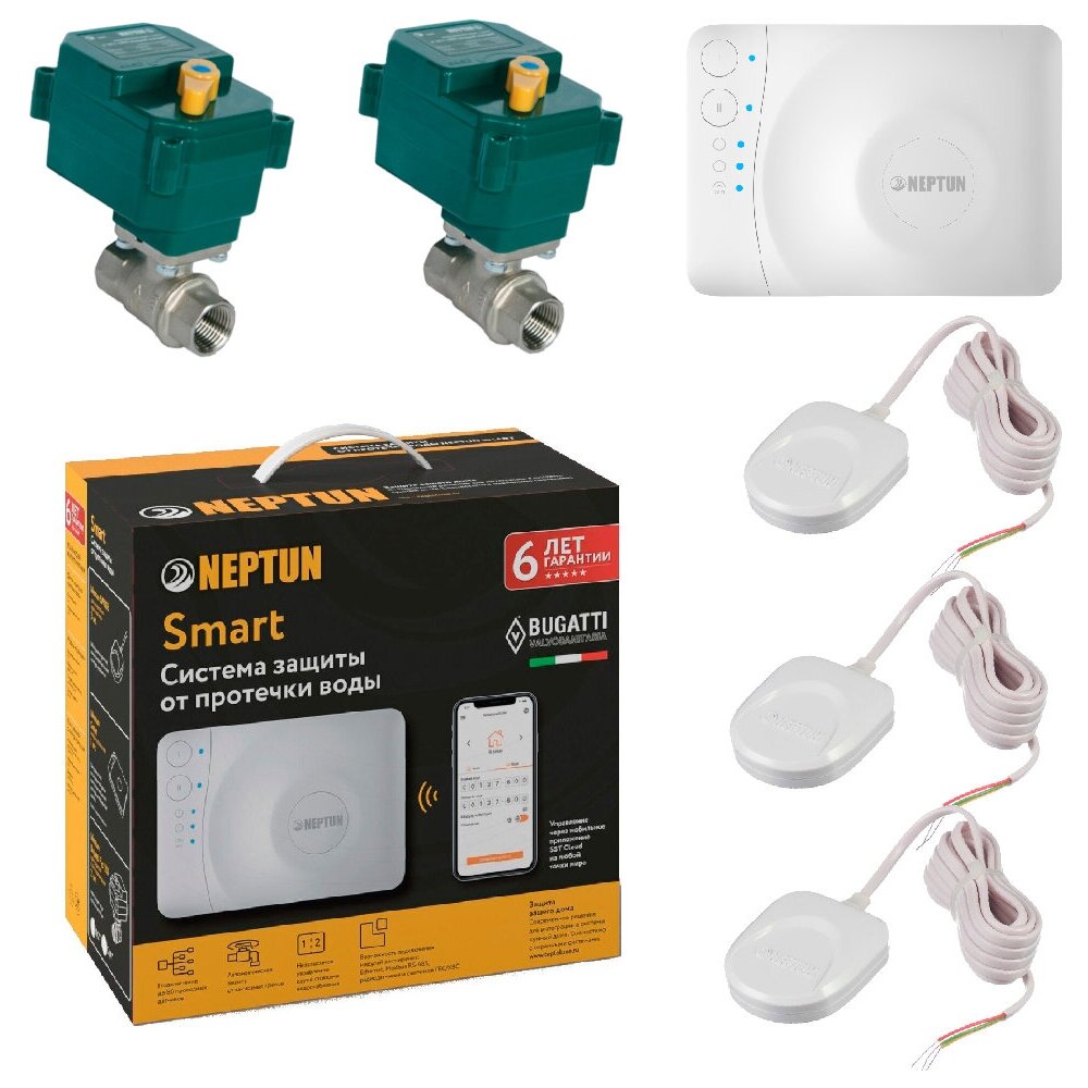 Умная система защиты от протечки воды Neptun Bugatti Smart предназначена для обнаружения и локализации протечек воды в системах водоснабжения. Компоненты системы связаны и взаимодействуют друг с другом через центральный контроллер (модуль управления Neptun Smart), который может быть дополнительно укомплектован дополнительными платами расширения: RS-485 (для систем диспетчеризации); Ethernet (для проводного подключения в случае невозможности организации подключения к Wi-Fi). Счетчики воды (для контроля показаний расхода воды с приборов учета ГВС и ХВС) Радиодатчики (для организации соединения с датчиками Neptun Smart 868) Контроль протечки воды осуществляется автоматически, не требует участия пользователя, а также позволяет проводить мониторинг системы с помощью приложения SST Cloud.---Функции: Контроль протечки воды. Автоматическая блокировка водоснабжения при срабатывании любого датчика. Звуковая и световая сигнализация об аварии. Запоминание состояния аварии до устранения ее последствий. Защита шарового крана от закисания (Автоматический проворот крана один или два раза в месяц). Отправка push-уведомлений о состоянии системы на смартфон. Мониторинг приборов учета расхода воды (счетчиков). Удаленное управление подачей воды при помощи смартфона. Максимальное количество проводных датчиков серии SW - 80 штук.--- Состав комплекта: Модуль управления Neptun Smart - 1 шт. Датчик Нептун SW 005 - 3 шт Кран шаровый с электроприводом Neptun Bugatti Pro 12В - 2 шт. Блок питания 12В - 1 шт.