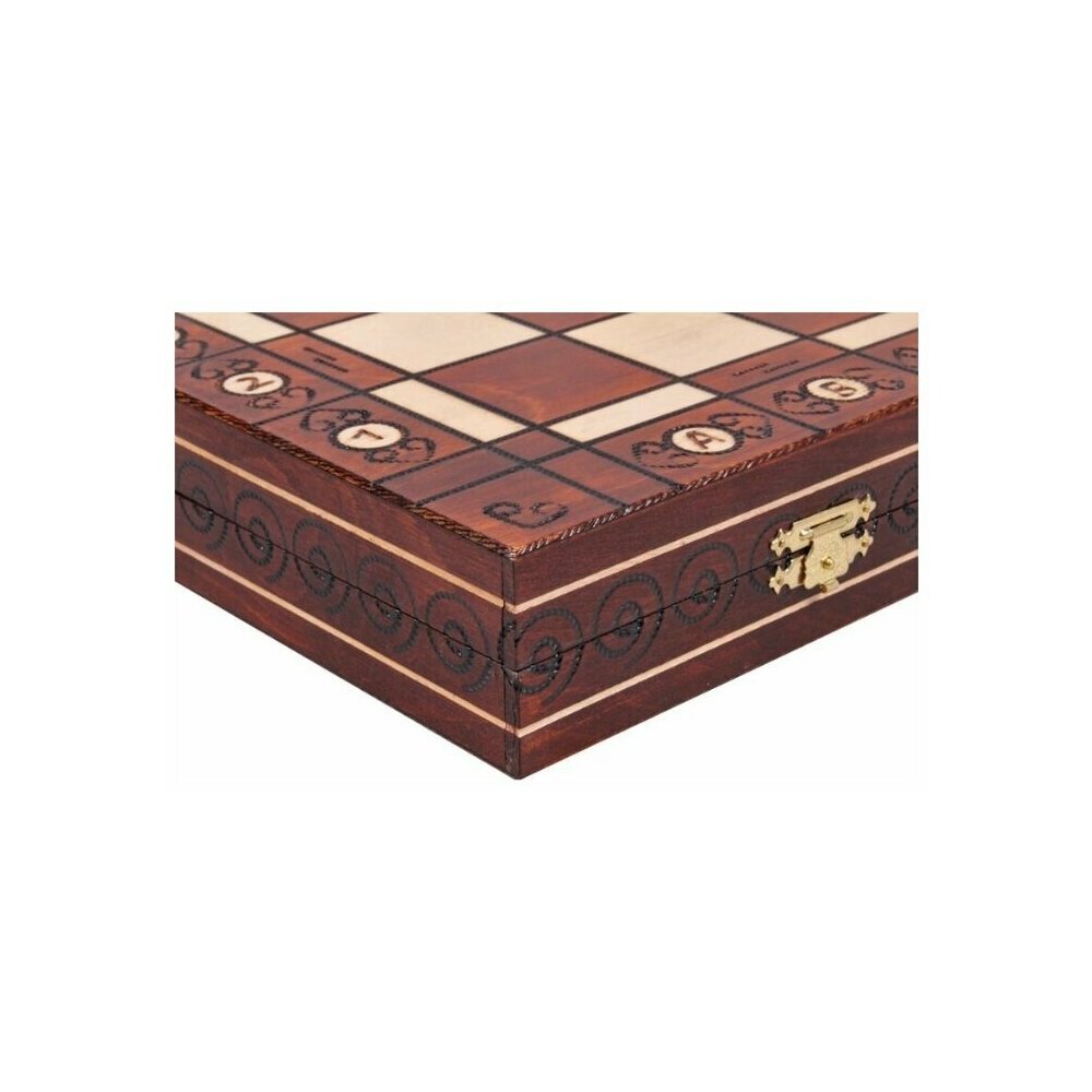 Шахматы «Амбассадор» премиум-качества сделаны полностью из берёзы. Цифры и границы клеток выполнены методом выжига. Фигуры также сделаны из берёзы, с утяжелением и бархатной подклейкой. Все фигуры хранятся в индивидуальных ячейках.<p>Размер доски в сложенном виде — 54 × 27 × 6 см. Шахматы упакованы в красивую полиграфическую коробку.</p>