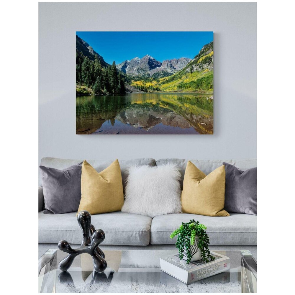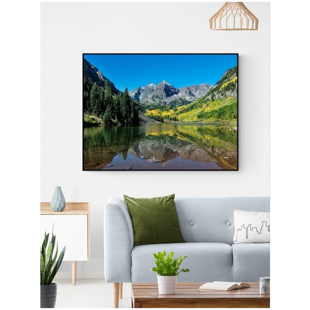 Чарующий вид на пики скалистых гор Марун Беллс, Колородо, США. Кристально-чистое озеро, отражающее осенний пейзаж.. Этот постер напечатан высококачественными чернилами на сатиновой плотной постерной бумаге. Он будет отлично смотреться как в рамке, так и без. Он отлично впишется в любой интерьер и станет украшением любого пространства. Все плакаты мы аккуратно сворачиваем вручную и отправляем в плотных крафтовых тубусах, так что ваш заказ гарантированно доедет до вас в целости и сохранности. Наши особенности: Высококачественные чернила, которые сохранят свои качества много лет, плотная постерная бумага (220г/м2), яркие насыщенные цвета, надежная доставочная упаковка и ручная сборка. Обратите внимание, что фотографии постеров в интерьерах приведены для примера. Они не отражают реальных пропорций и используются, чтобы показать, как постер может смотреться на стене. Мы печатаем все плакаты в трех размерах: S - 40x50 см, M - 50x70 см и L - 60x90 см. В связи с тем, что на разных операционных системах и мониторах разные настройки цвета - финальный принт может немного отличаться от того, что вы видите на экране. Сделано в России, в Москве