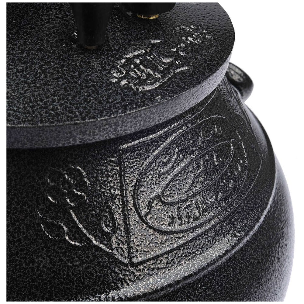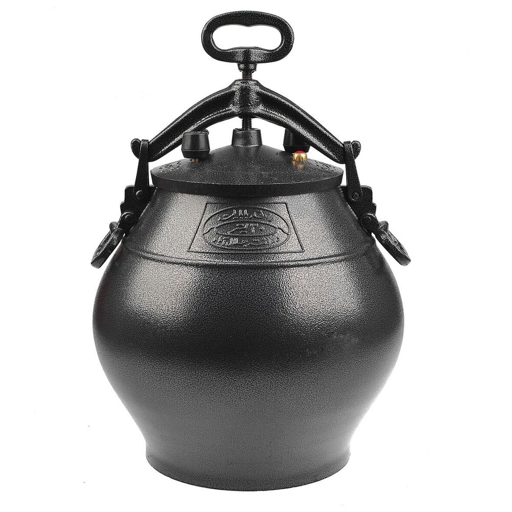 Афганский казан изготовлен из толстостенного пищевого алюминия. Сверху казан накрывается крышкой, на которой расположены 3 клапана сброса давления. 2 рабочих клапана и 1 аварийный для безопасности. В самой крышке есть паз, куда помещается уплотнительная резиновая прокладка. Чтобы крышка плотно прижималась к корпусу, посуда комплектуется коромыслом.Благодаря такой продуманной конструкции внутри и создается высокое давление при закипании воды. Толстые стенки не дают давлению выйти наружу, а 3 клапана сброса давления не позволяют скапливаться избыточному давлению, делая эту посуду безопасной. Такой казан можно использовать не только на домашней плите, но и брать с собой на природу и готовить на костре. Еда в такой скороварке готовиться очень быстро благодаря высокому давлению и сохраняет все её полезные свойства. В такой посуде можно готовить практически всё, что угодно - каши, жаркое, супы, различные тушения и много, чего ещё.