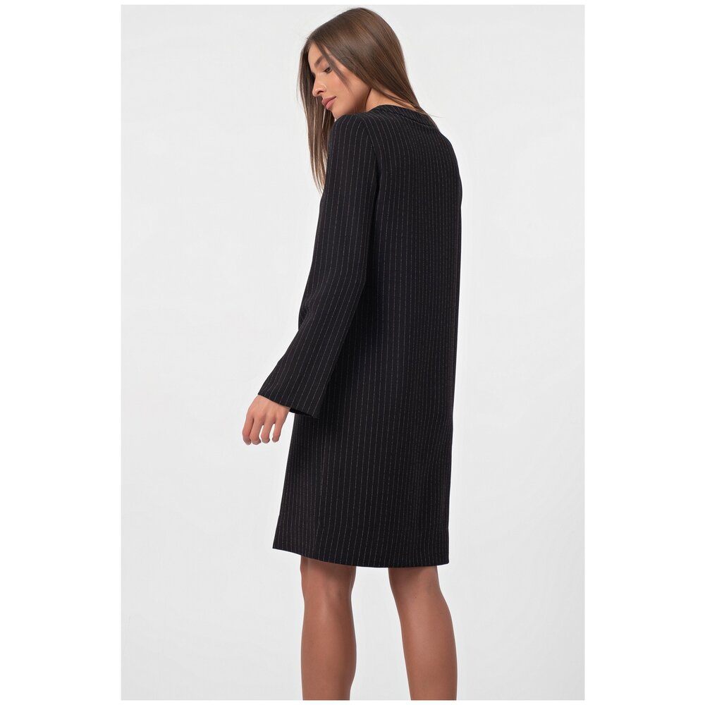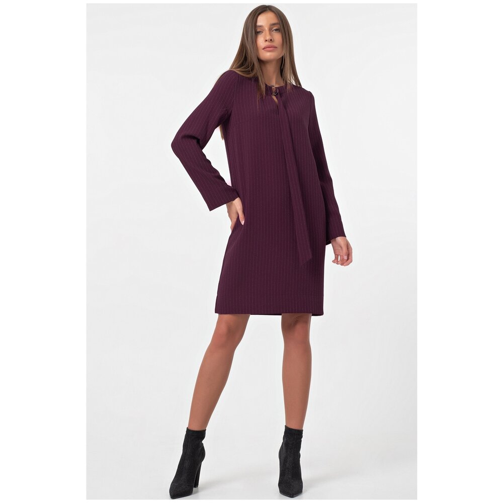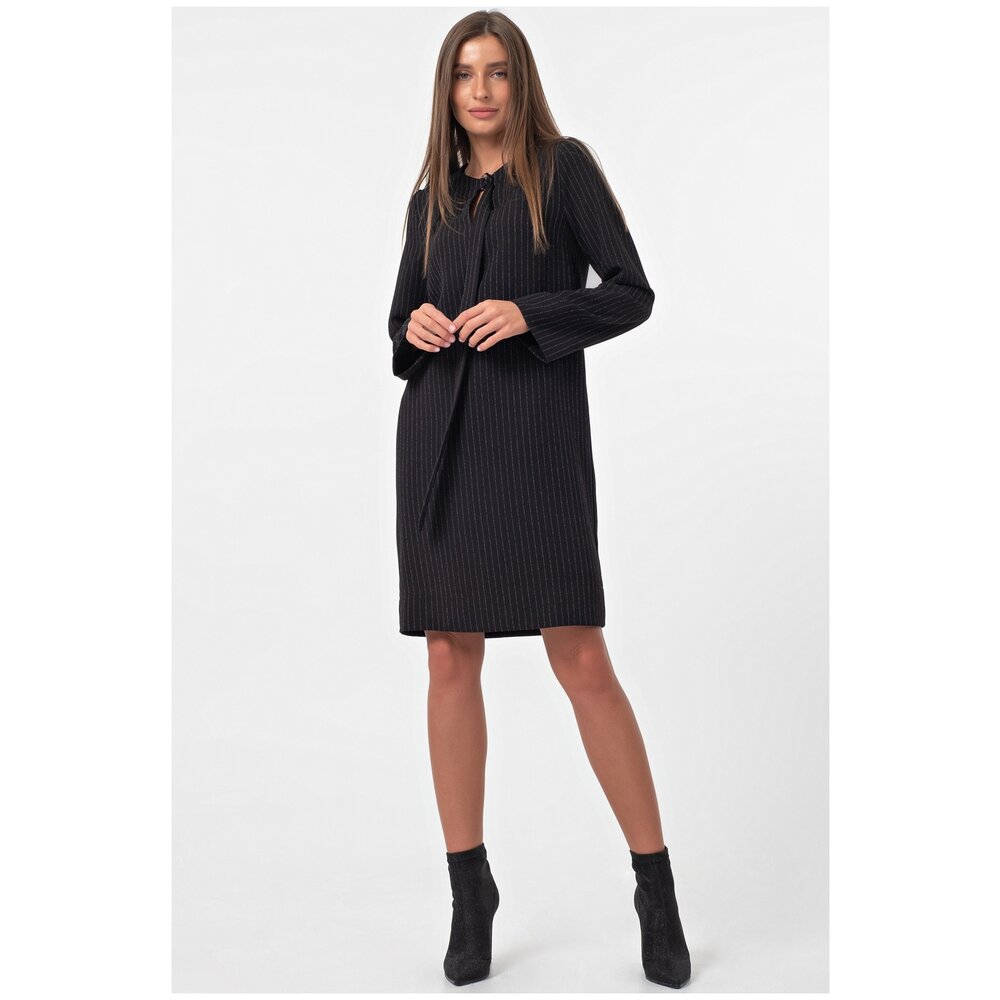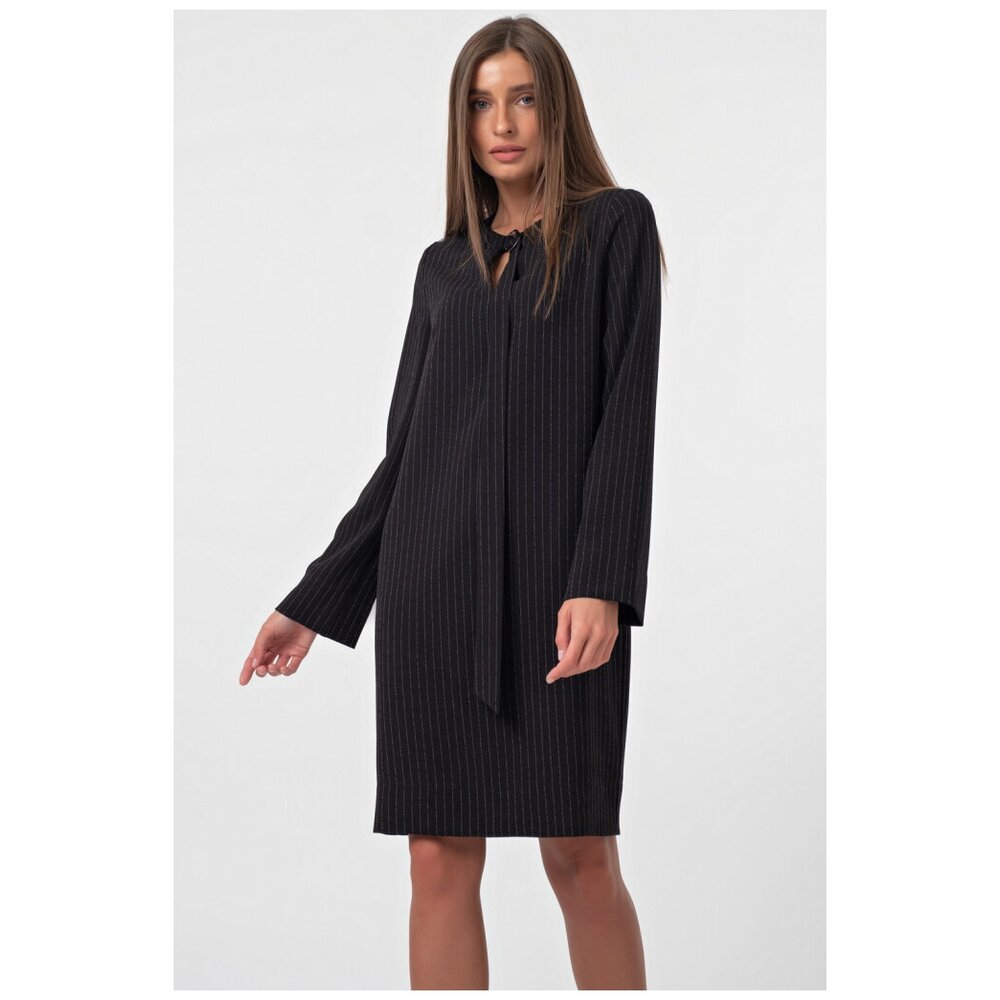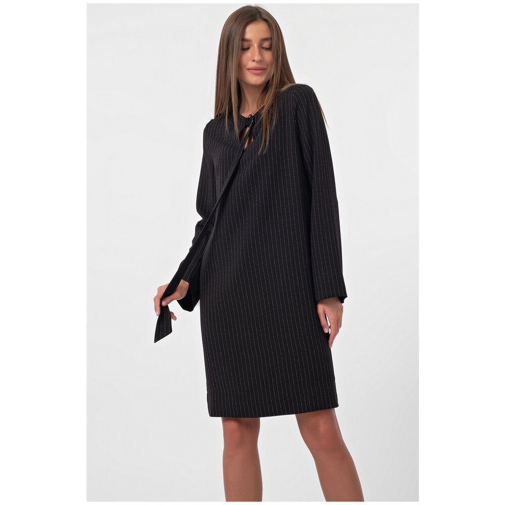 Платье прямого силуэта из креповой ткани в тонкую полоску. Округлая форма горловины, по горловине отделка с двумя полукольцами и длинной завязкой, рукав втачной с широкой подгибкой слегка расклешенный, по низу изделия - широкая подгибка.