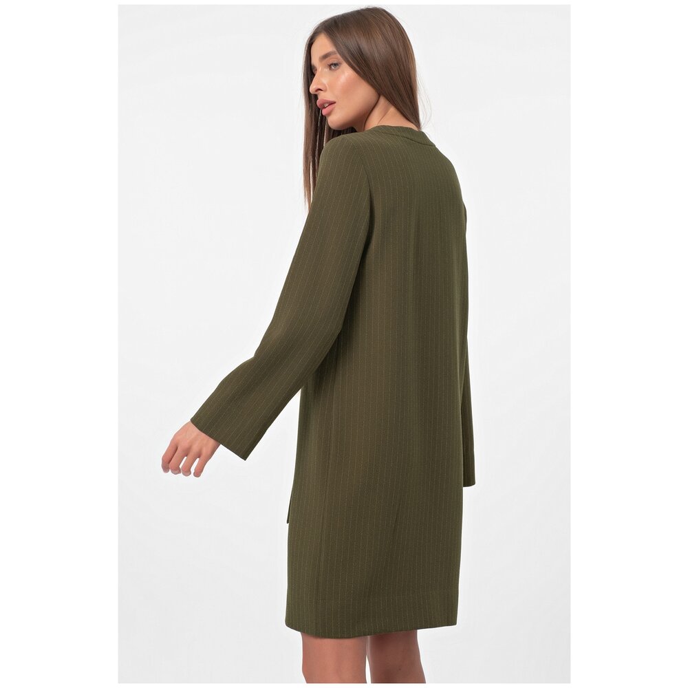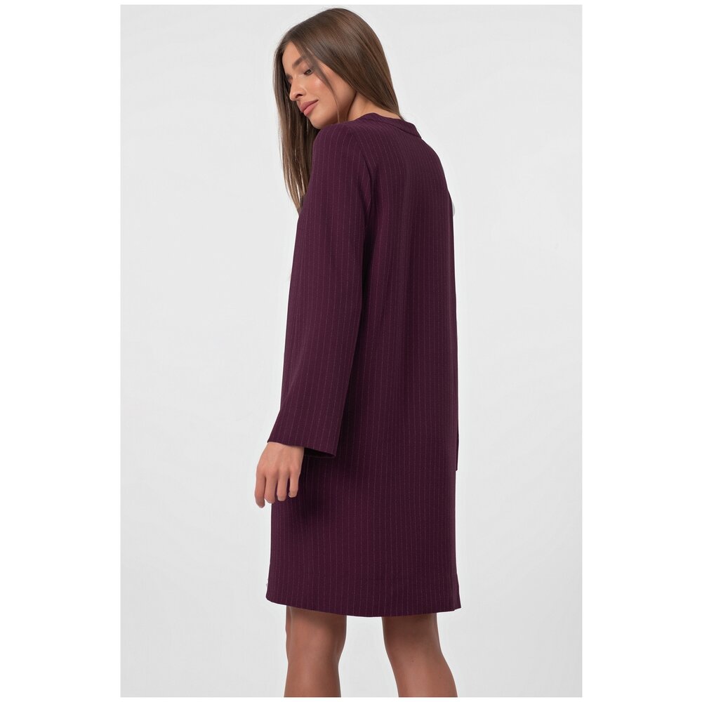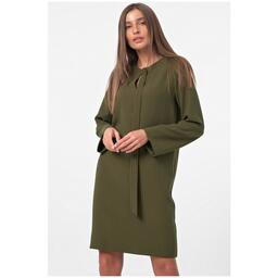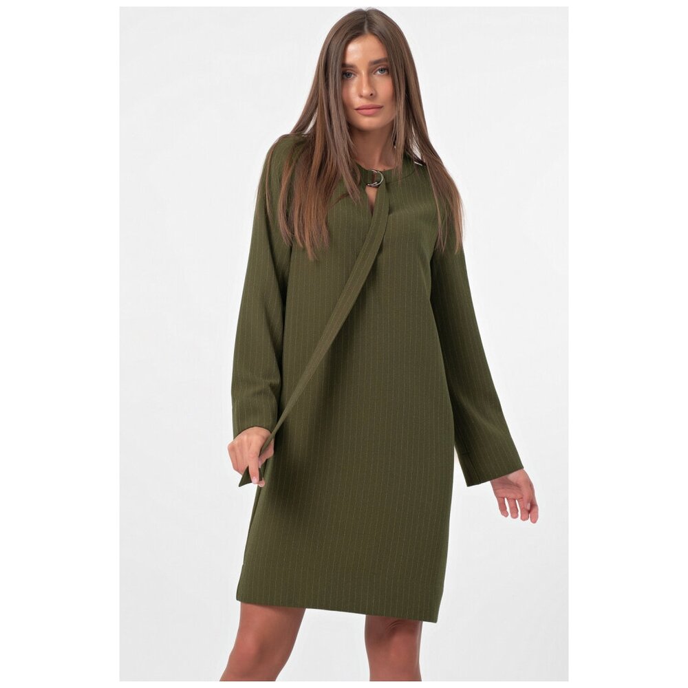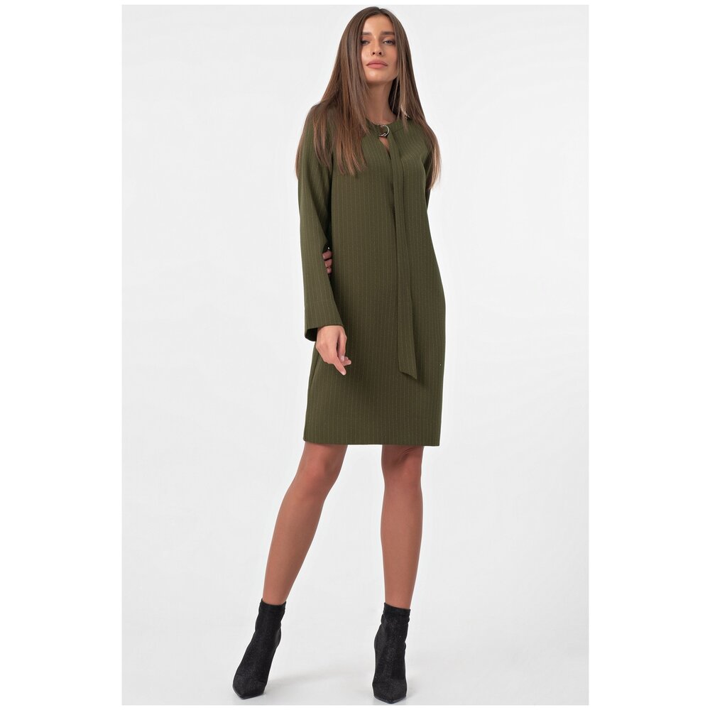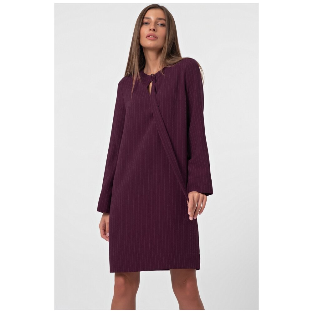 Платье прямого силуэта из креповой ткани в тонкую полоску. Округлая форма горловины, по горловине отделка с двумя полукольцами и длинной завязкой, рукав втачной с широкой подгибкой слегка расклешенный, по низу изделия - широкая подгибка.