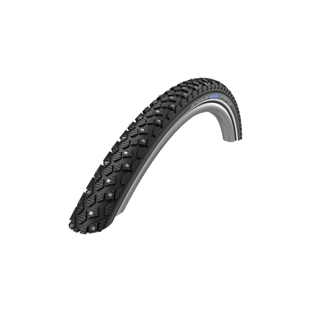 Покрышка SCHWALBE Marathon Winter - качественная шипованная модель с трехуровневой защитой K-Guard и светоотражающей полосой. Данная шина обеспечивает превосходную управляемость на скользких поверхностях. Стальной каркас имеет прочность 50 EPI. Все это делает покрышку отличным выбором в зимний сезон.