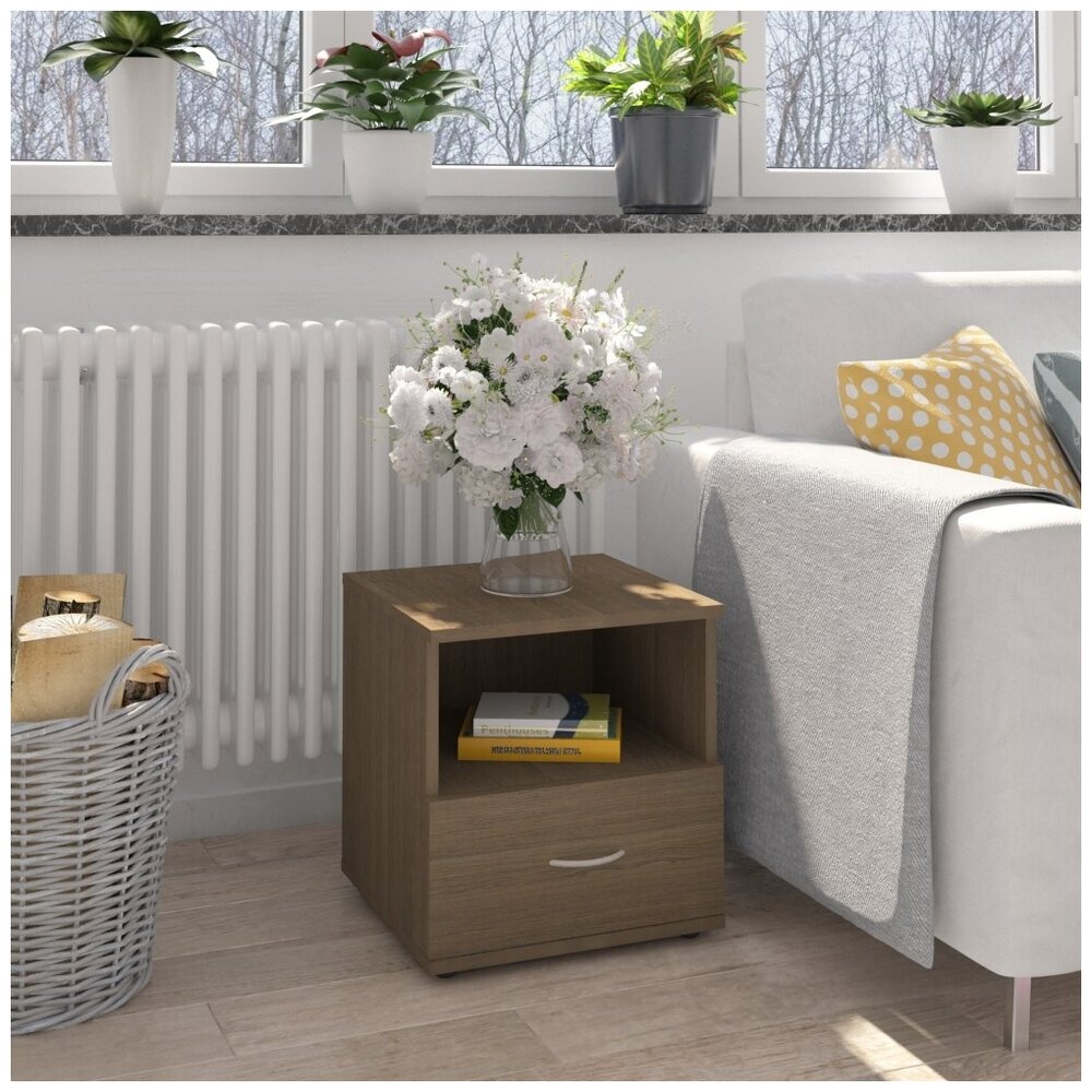 Тумба прикроватная с 1-м выдвижным ящиком на роликовых направляющих и открытой нишей, донышко ящика и задняя стенка ДВП 3,2 мм, видимые торцы в кромке ПВХ 0,45 мм.