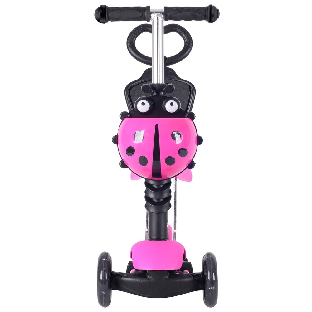 Самокат 5 в 1. Данная модель снабжена съемным детским сиденьем, которое прочно, надежно и безопасно крепится к основе самоката. Наклонная система поворота очень удобна для детей, а также развивает их координацию. Для самых маленьких "гонщиков", а также для их родителей, в комплект уже входит специальная съемная ручка управления, которая снабжена спинкой, комфортно регулируемой по высоте. Детский самокат-трансформер имеет две основные функции, при установленном сиденье - это беговел для совсем маленьких, если сиденье снято - это полноценный самокат. Регулируемая ручка: 60х83 см. Нагрузка до 25 кг.