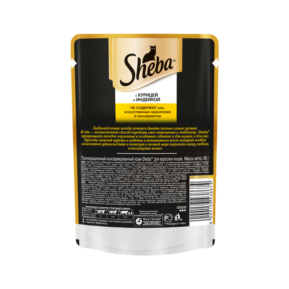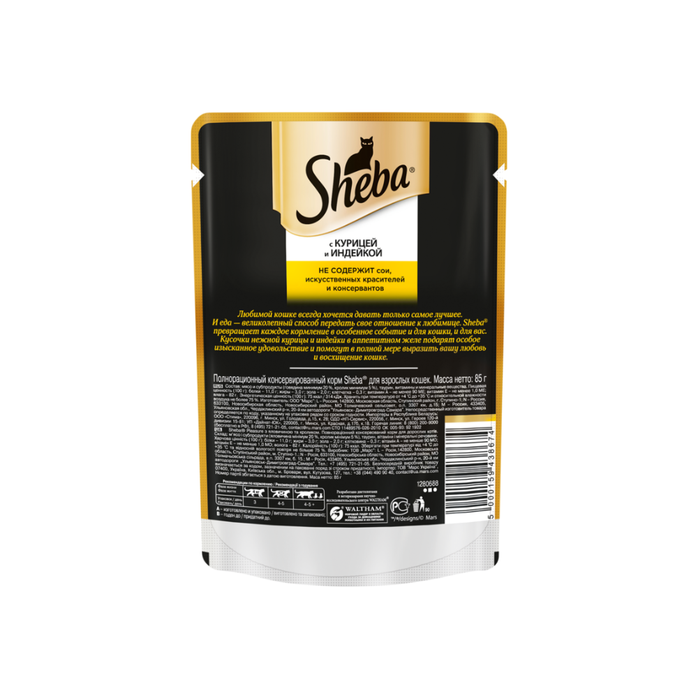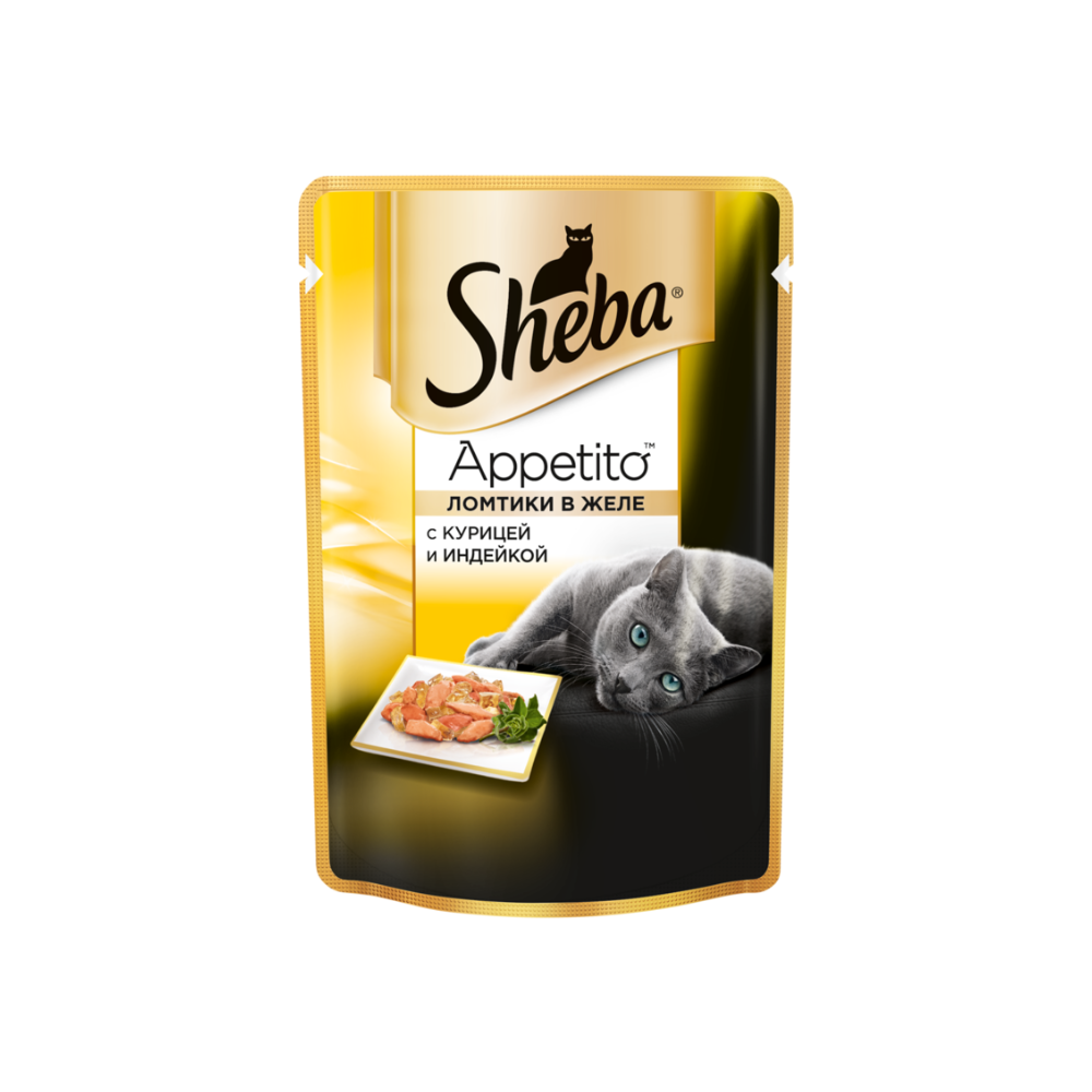 Корм Sheba Appetito с курицей и индейкой в нежном желе — это самый элегантный способ выразить к любовь своему питомцу. Изысканное сочетание двух видов мяса подарит кошке особенное, ни с чем не сравнимое удовольствие. Ломтики нежной курицы и индейки так и таят во рту, а насыщенный вкус аппетитного желе приятно удивит вашу любимицу. Sheba Appetito порадует кошку новыми гранями вкуса и утончёнными сочетаниями. Рекомендуется кормить кошку кормом комнатной температуры. Корм предназначен только для взрослых кошек: - для взрослых кошек от 4-х кг — не более 3 упаковок в день; - для взрослых кошек во время беременности — 4–5 упаковок в день; - для взрослых кошек, кормящих котят — от 4–5 упаковок в день. В миске питомца всегда должна быть свежая вода.