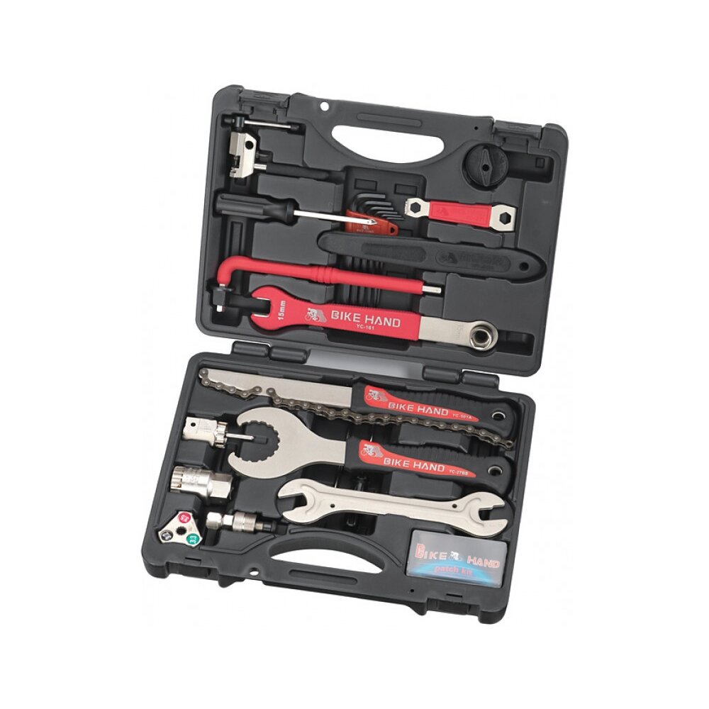 "Всё в одном", профи, 18 позиций: аптечка, монтировки, выжимка, ключи, отвертки, съемники и пр., для сборки, разборки, настройки, регулировки и ремонта велосипеда, в пластиковом кейсе.