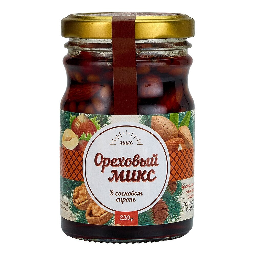 Ореховый микс в сосновом сиропе (220 гр) – таежное лакомство для тех, кто хочет попробовать самые вкусные цельные орешки в сиропе из сосновых шишек. В одной баночке собраны миндаль, фундук, грецкие и кедровые орехи, которые обволакивает ароматный сироп свежести хвойного леса. Гармоничный натуральный состав без консервантов порадует за завтраком с блинчиками, творогом и йогуртом. Цельные орехи станут аппетитным украшением домашней выпечки. Мы заботимся о доставке, поэтому упаковываем стеклянную банку в пузырьковую пленку и надежную транспортную коробку. Смело попробуйте сами или сделайте подарок друзьям и близким. Чаепитие с сибирским десертом - оригинально и полезно для здоровья!