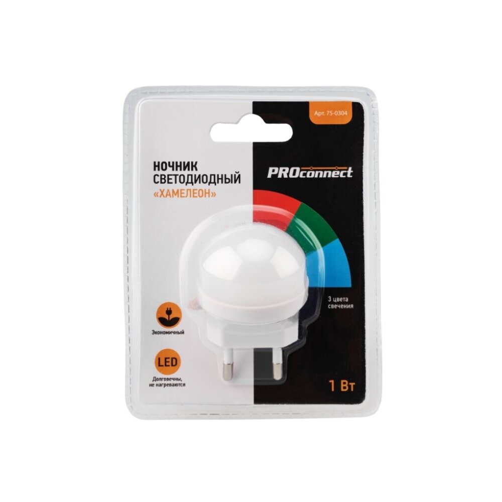 Светодиодный ночник RGB. RGB ночник имеет 3 цвета: красный, зеленый, голубой. Ночник легкий и компактный, имеет оригинальный дизайн и подходит для создания уникального интерьера и уютной обстановки дома. Удобен в использовании как декоративный светильник или ночник. Особенности: Обеспечивает безопасность в темных помещениях. Мягкое освещение. В блистерной упаковке. Экономия электроэнергии. Технические характеристики: Светодиоды: 1 шт. Цвет: красный, зеленый, голубой Питание: сеть 220 В Потребляемая мощность: 1 Вт