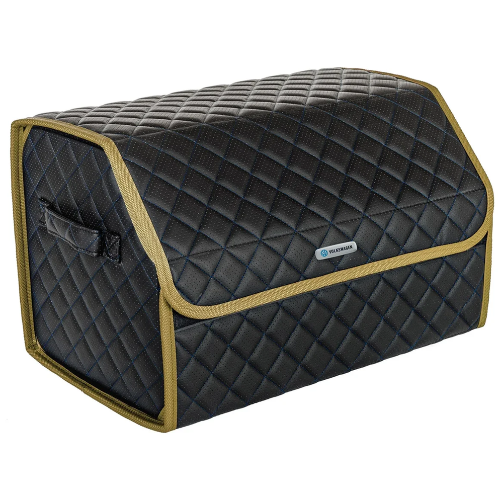 Сумка-органайзер в багажник автомобиля из перфорированной экокожи черная с синей нитью ViceCar с логотипом VOLKSWAGEN (бежевый кант)