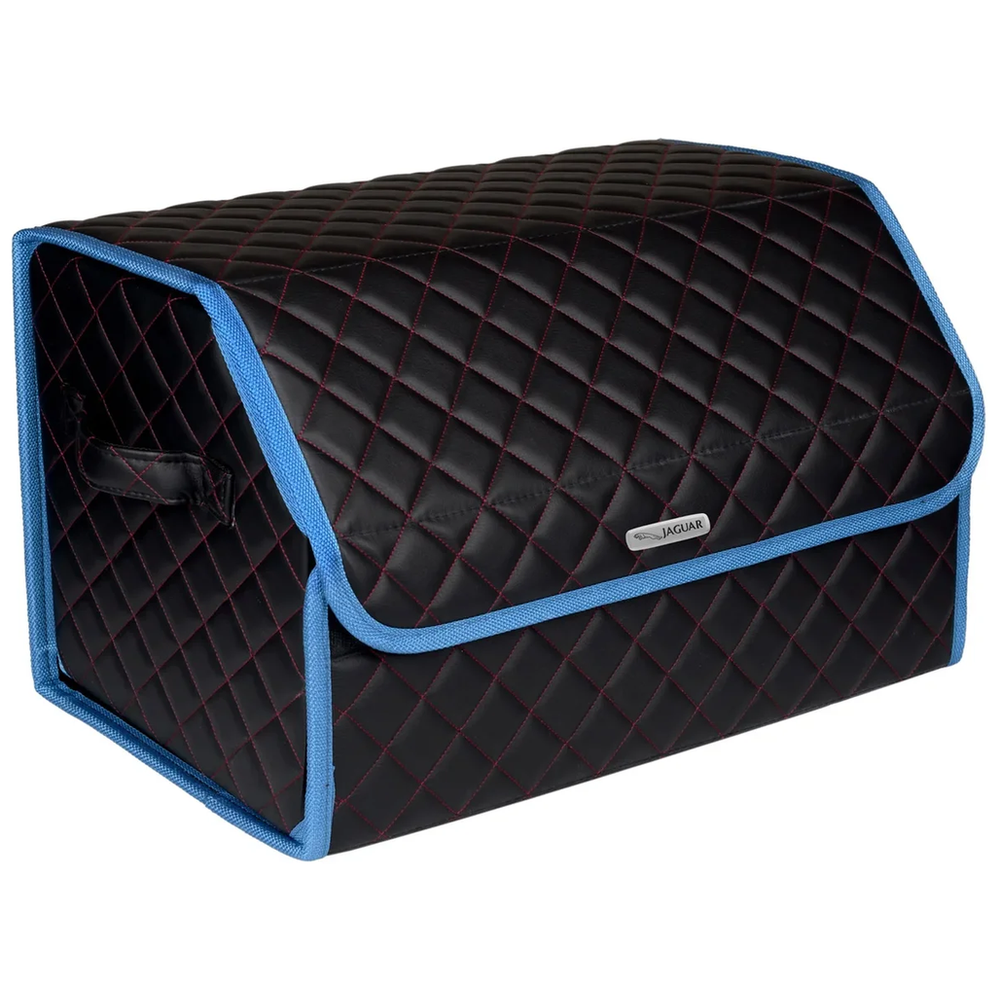 Сумка-органайзер в багажник автомобиля из экокожи черная с красной нитью ViceCar с логотипом JAGUAR (светло-синий кант)