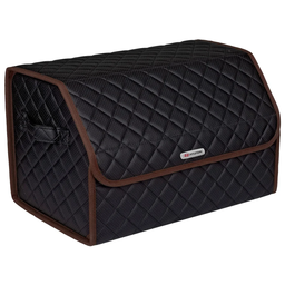 Сумка-органайзер в багажник автомобиля из перфорированной экокожи черная с черной нитью ViceCar с логотипом HYUNDAI (коричневый кант)