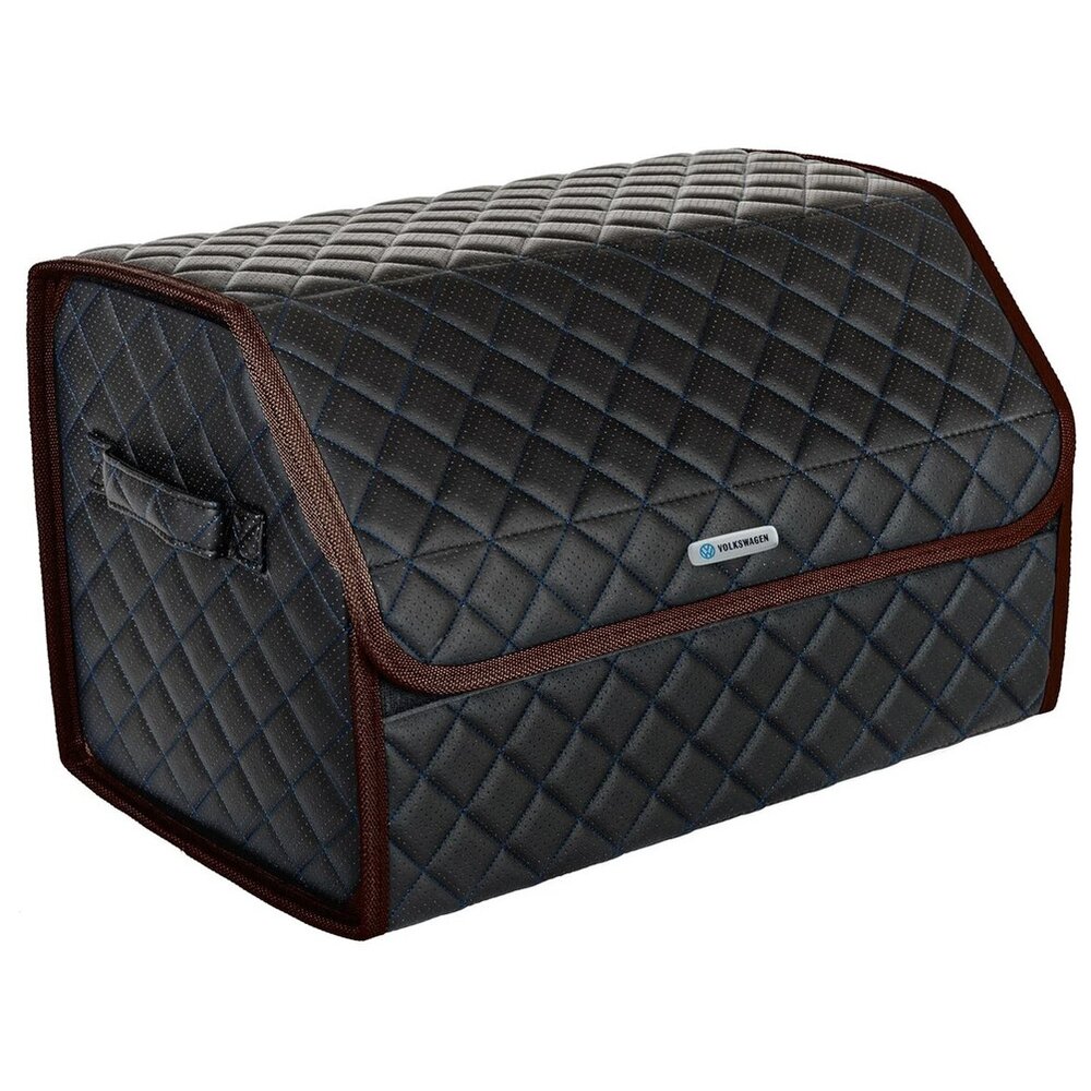 Сумка-органайзер в багажник автомобиля из перфорированной экокожи черная с синей нитью ViceCar с логотипом VOLKSWAGEN (коричневый кант)