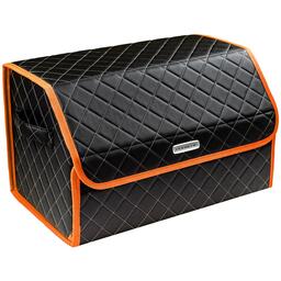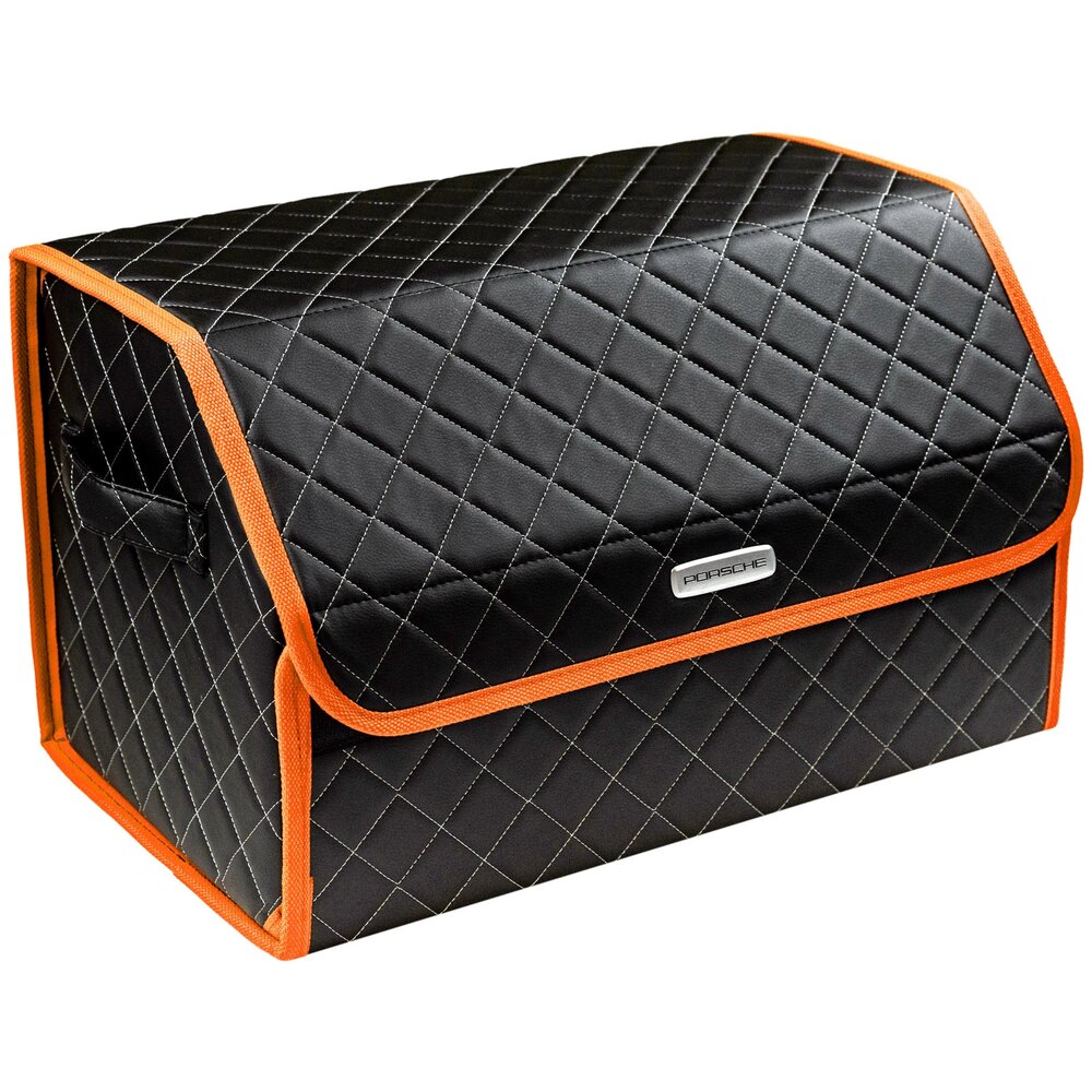 Сумка-органайзер в багажник автомобиля из экокожи черная с серой нитью ViceCar (оранжевый кант) с логотипом PORSCHE