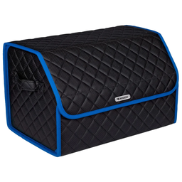 Сумка-органайзер в багажник автомобиля из перфорированной экокожи черная с черной нитью ViceCar с логотипом RENAULT (темно-синий кант)