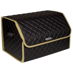 Сумка-органайзер в багажник автомобиля из экокожи черная с красной нитью ViceCar с логотипом MAZDA (бежевый кант)
