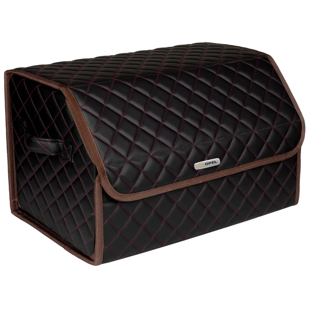 Сумка-органайзер в багажник автомобиля из экокожи черная с красной нитью ViceCar с логотипом OPEL (коричневый кант)