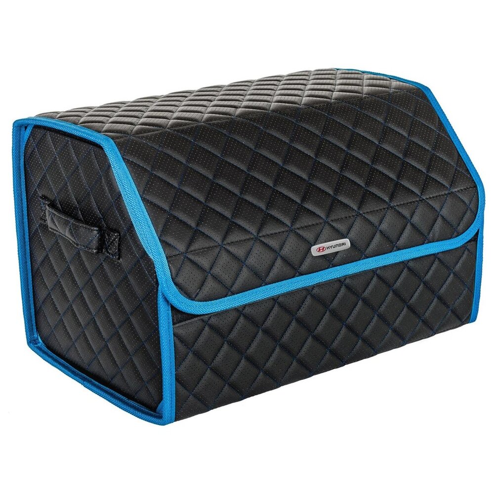 Сумка-органайзер в багажник автомобиля из перфорированной экокожи черная с синей нитью ViceCar с логотипом HYUNDAI (светло-синий кант)