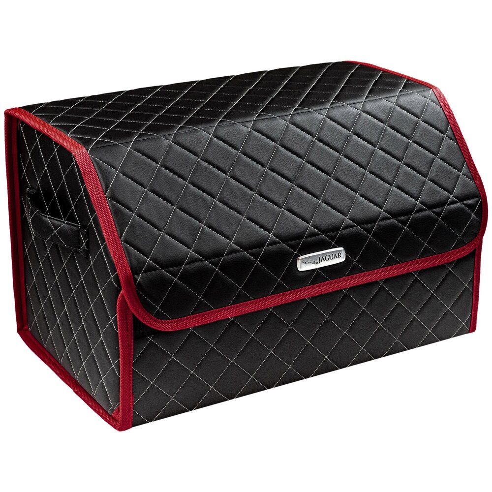 Сумка-органайзер в багажник автомобиля из экокожи черная с серой нитью ViceCar (бордовый кант) с логотипом JAGUAR