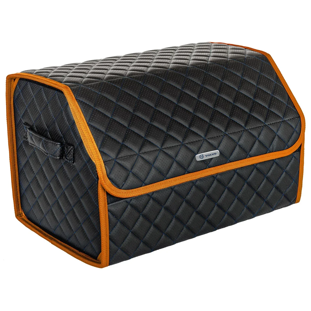 Сумка-органайзер в багажник автомобиля из перфорированной экокожи черная с синей нитью ViceCar с логотипом VOLVO (оранжевый кант)