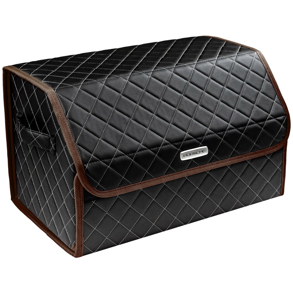 Сумка-органайзер в багажник автомобиля из экокожи черная с серой нитью ViceCar (коричневый кант) с логотипом PORSCHE