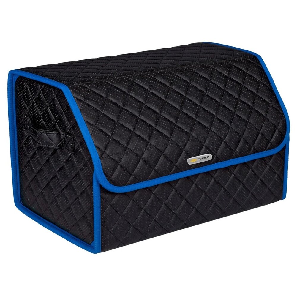 Сумка-органайзер в багажник автомобиля из перфорированной экокожи черная с черной нитью ViceCar с логотипом CHEVROLET (темно-синий кант)