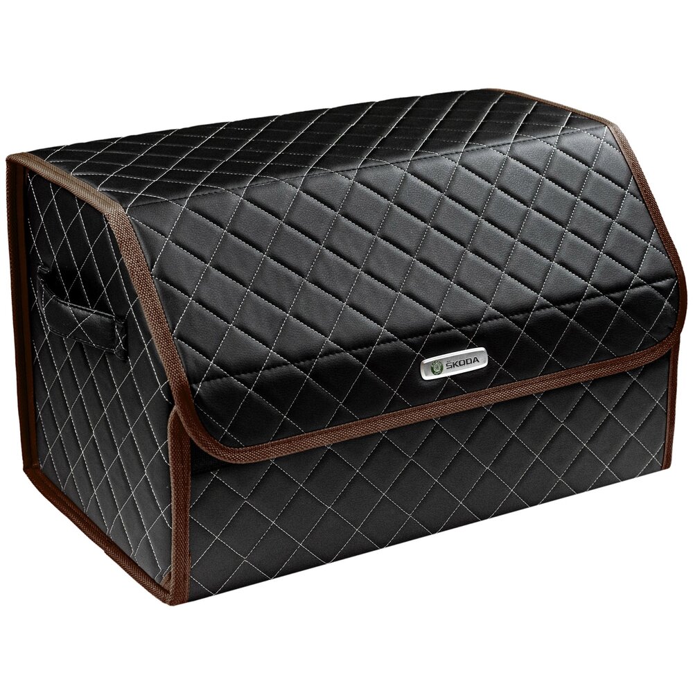 Сумка-органайзер в багажник автомобиля из экокожи черная с серой нитью ViceCar (коричневый кант) с логотипом SKODA