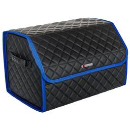 Сумка-органайзер в багажник автомобиля из перфорированной экокожи черная с синей нитью ViceCar c логотипом S-LINE (темно-синий кант)