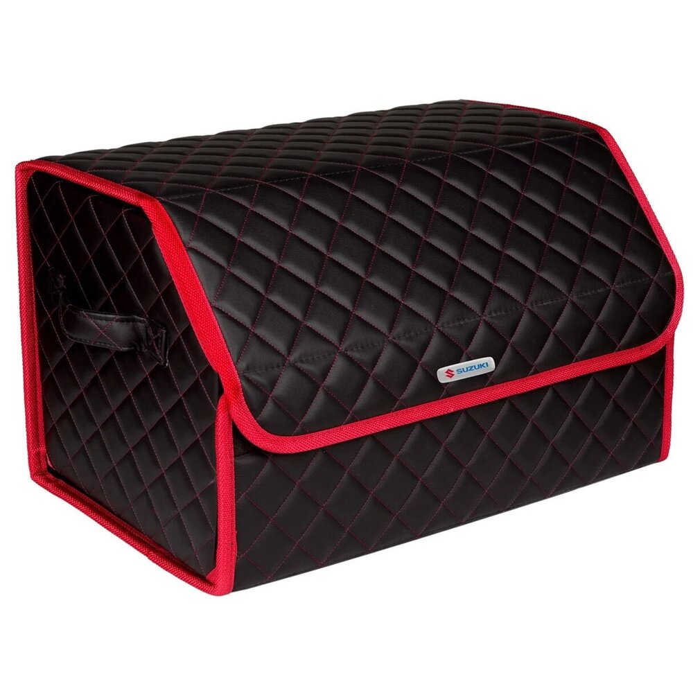Сумка-органайзер в багажник автомобиля из экокожи черная с красной нитью ViceCar с логотипом SUZUKI (красный кант)