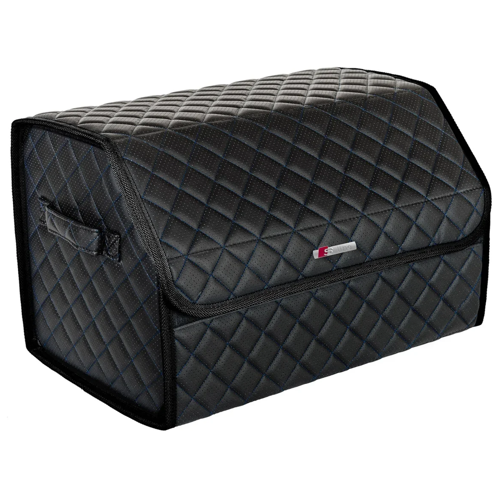 Сумка-органайзер в багажник автомобиля из перфорированной экокожи черная с синей нитью ViceCar c логотипом S-LINE (черный кант)