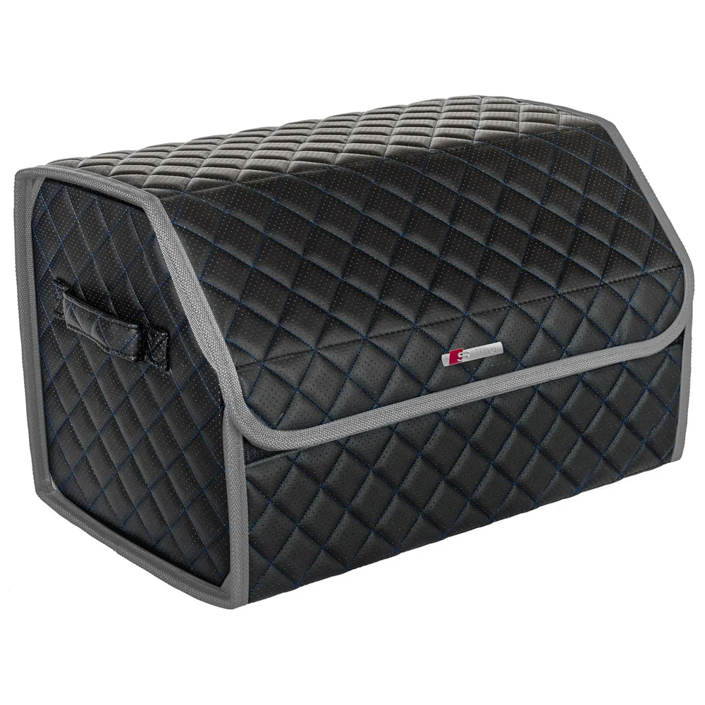 Сумка-органайзер в багажник автомобиля из перфорированной экокожи черная с синей нитью ViceCar с логотипом S-LINE (светло-серый кант)