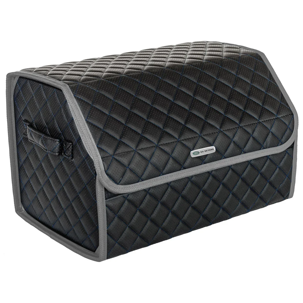 Сумка-органайзер в багажник автомобиля из перфорированной экокожи черная с синей нитью ViceCar с логотипом LAND ROVER (светло-серый кант)
