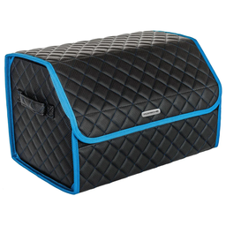 Сумка-органайзер в багажник автомобиля из перфорированной экокожи черная с синей нитью ViceCar с логотипом PORSHE (светло-синий кант)