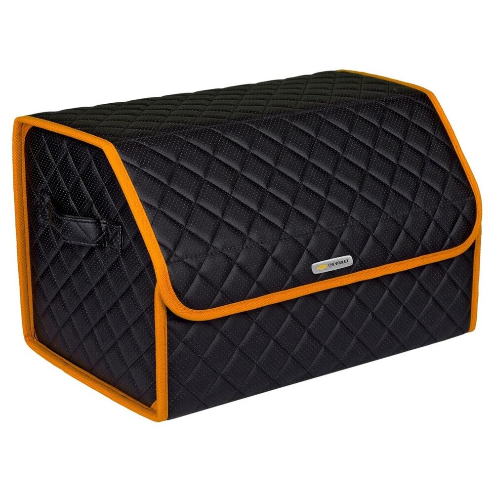 Сумка-органайзер в багажник автомобиля из перфорированной экокожи черная с черной нитью ViceCar с логотипом CHEVROLET (оранжевый кант)