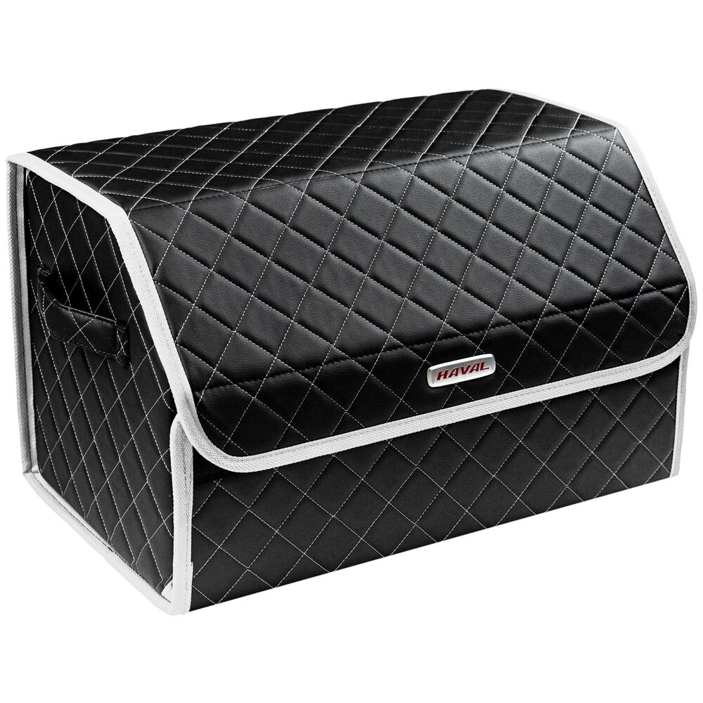 Сумка-органайзер в багажник автомобиля из экокожи черная с серой нитью ViceCar (белый кант) с логотипом HAVAL