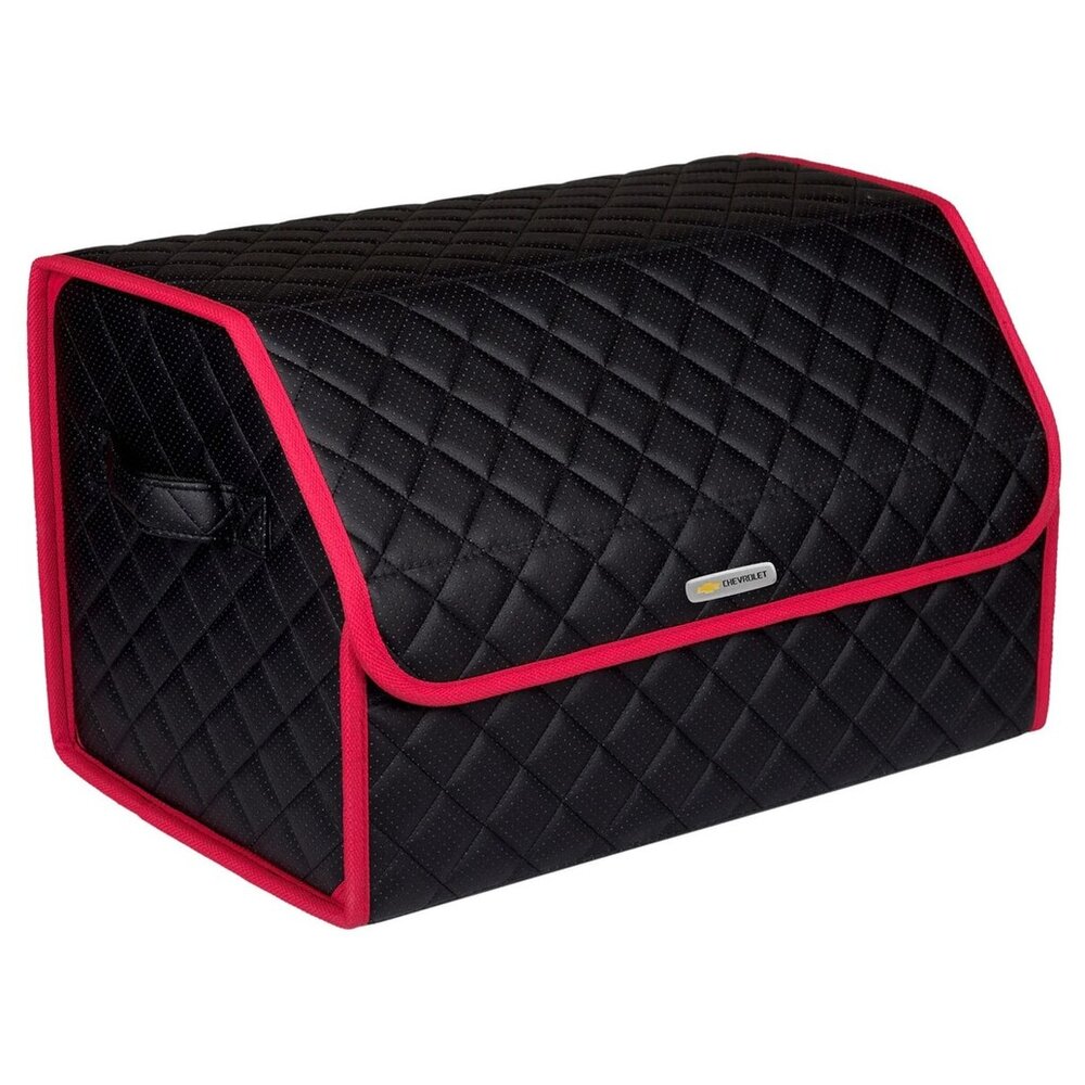 Сумка-органайзер в багажник автомобиля из перфорированной экокожи черная с черной нитью ViceCar c логотипом CHEVROLET (красный кант)