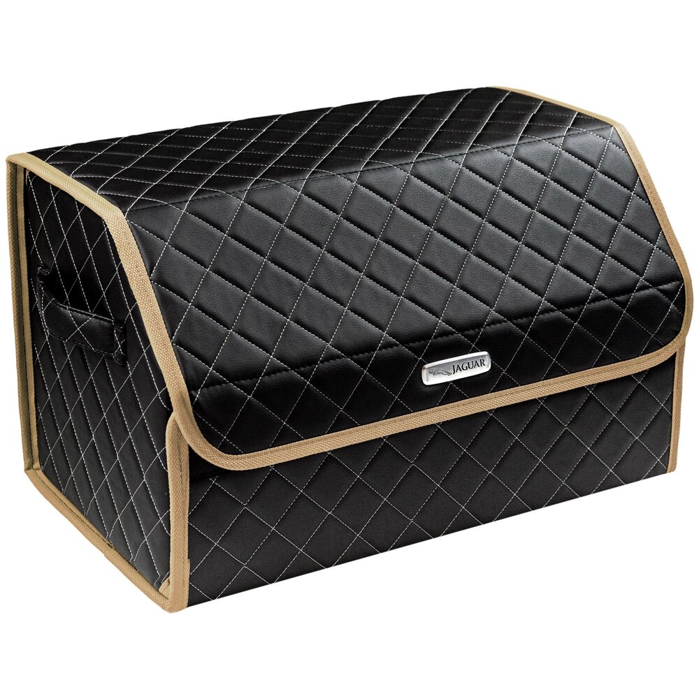 Сумка-органайзер в багажник автомобиля из экокожи черная с серой нитью ViceCar (бежевый кант) с логотипом JAGUAR