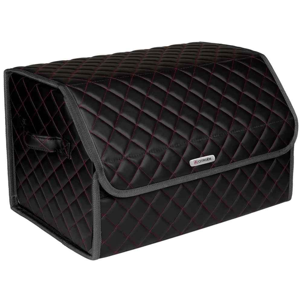 Сумка-органайзер в багажник автомобиля из экокожи черная с красной нитью ViceCar с логотипом CITROEN (темно-серый кант)