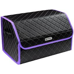 Сумка-органайзер в багажник автомобиля из экокожи черная с серой нитью ViceCar (фиолетовый кант) с логотипом SKODA