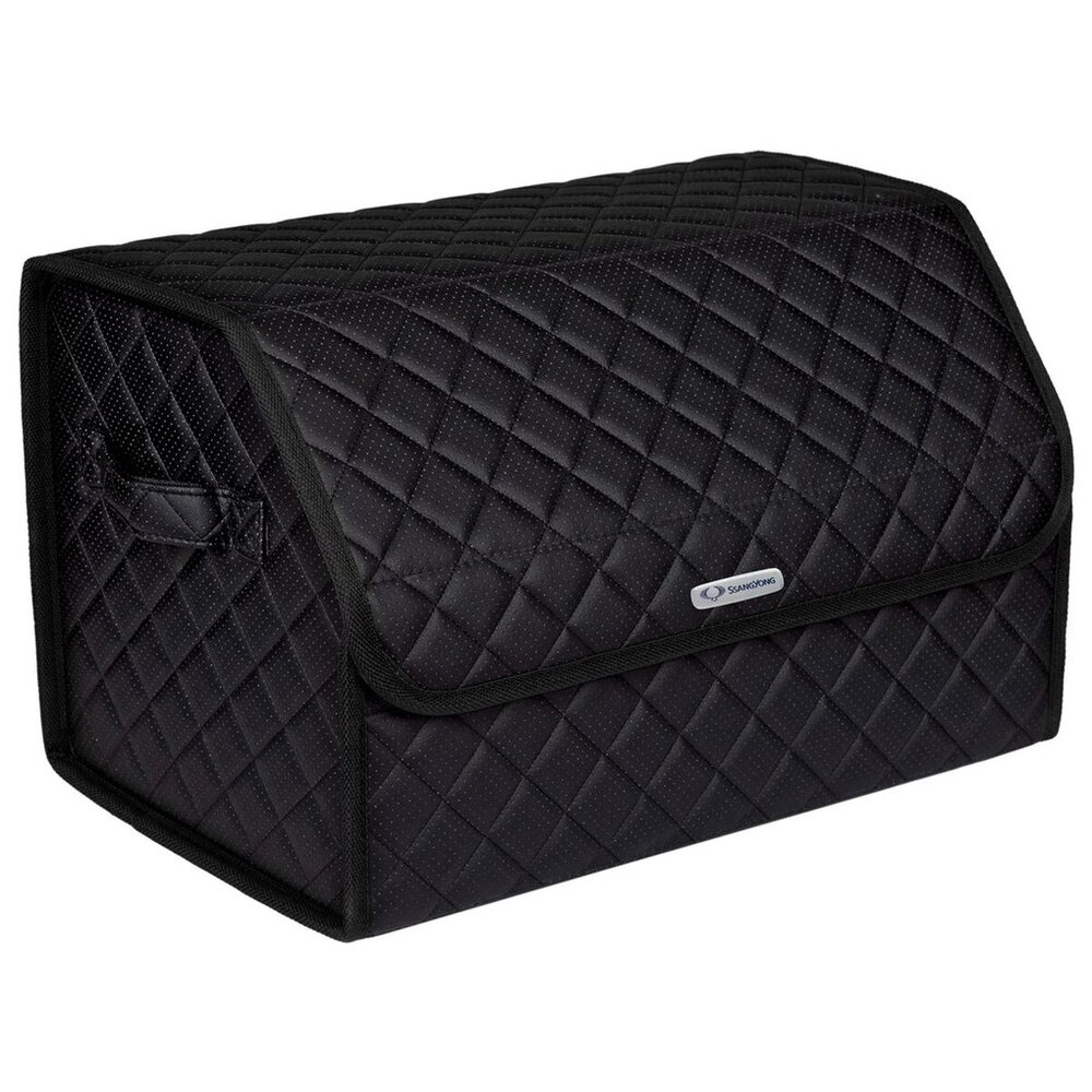 Сумка-органайзер в багажник автомобиля из перфорированной экокожи черная с черной нитью ViceCar с логотипом SSANG-YONG (черный кант)