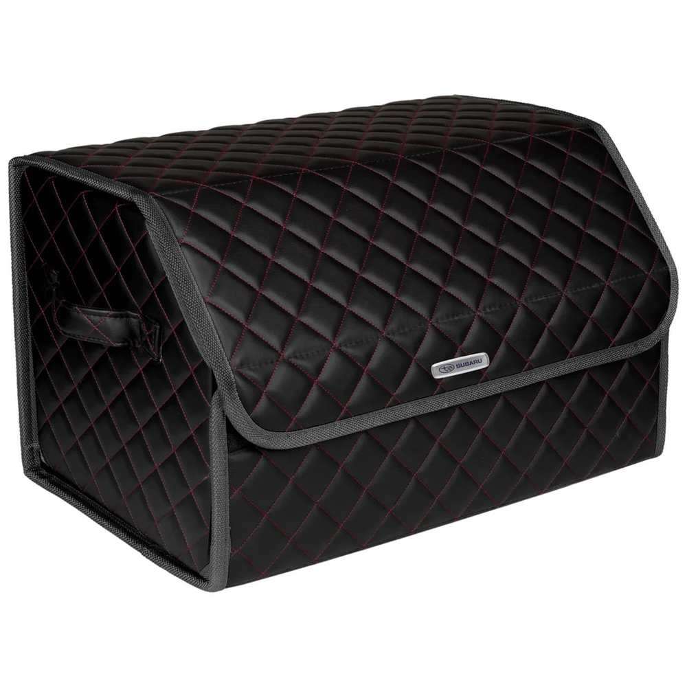 Сумка-органайзер в багажник автомобиля из экокожи черная с красной нитью ViceCar с логотипом SUBARU (темно-серый кант)