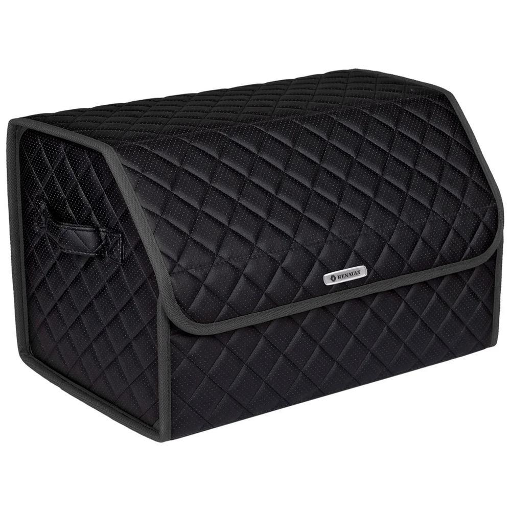 Сумка-органайзер в багажник автомобиля из перфорированной экокожи черная с черной нитью ViceCar с логотипом RENAULT (темно-серый кант)