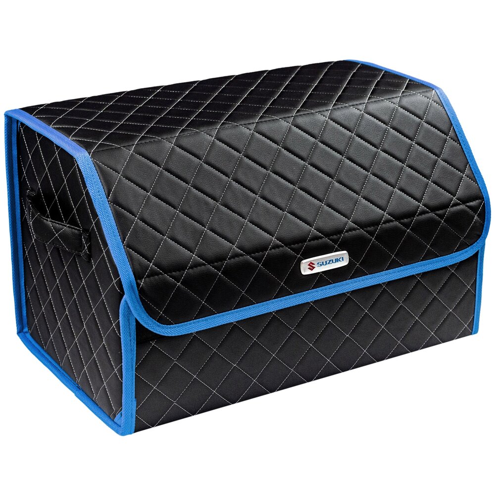 Сумка-органайзер в багажник автомобиля из экокожи черная с серой нитью ViceCar (синий кант) с логотипом SUZUKI