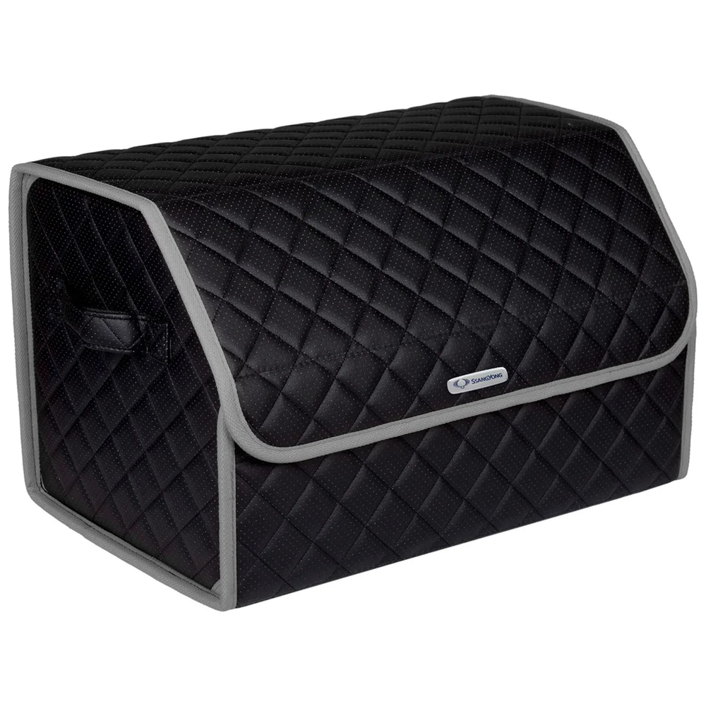 Сумка-органайзер в багажник автомобиля из перфорированной экокожи черная с черной нитью ViceCar с логотипом SSANG-YONG (светло-серый кант)