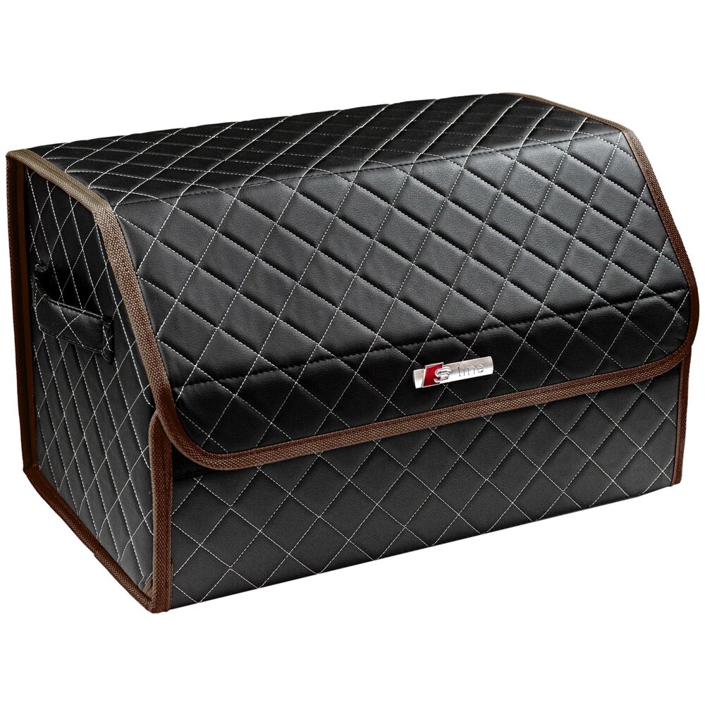 Сумка-органайзер в багажник автомобиля из экокожи черная с серой нитью ViceCar (коричневый кант) с логотипом S-LINE