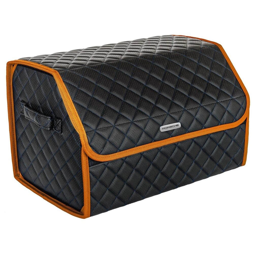 Сумка-органайзер в багажник автомобиля из перфорированной экокожи черная с синей нитью ViceCar с логотипом PORSHE (оранжевый кант)